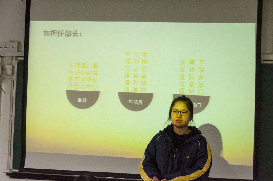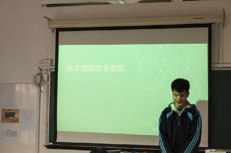 本次会议由工作站站长主持。大会伊始,站长致开场辞,向在座的各位同学介绍了换届选举流程。11位候选人分别按照策划部、宣传部、外联部、技术部、记者部的顺序依次上台竞选演讲。