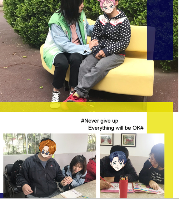 操场另一角,坐着一位失明的孩子,四十岁左右。她的世界是黑暗的,她感觉到有人经过她面前时,她兴奋地大叫,紧接着抽自己耳光,好像是在用一种极端的方式抵触着我们的到来。志愿者被吓了一跳,但还是有志愿者慢慢走上前,轻轻地安抚她。她慢慢得平静下来,或许是她渴望光明,渴望看到这世界上的万物复苏,可又做不到,于是,在黑暗中发出了这样的哀求......