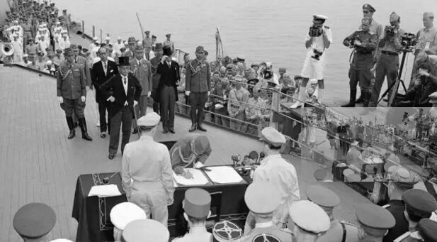日本代表登上美军“密苏里号”军舰,