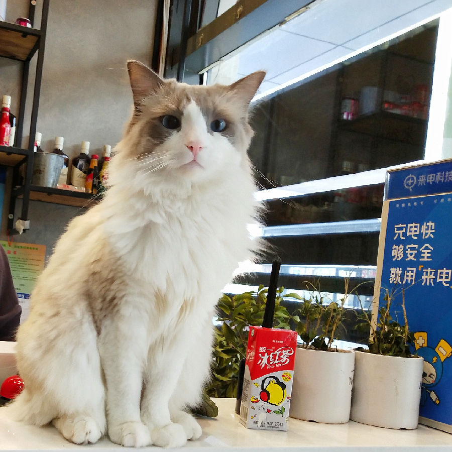 推开店门,便看到一只毛色如雪般的布偶站在柜台上,双眼如同名贵的蓝宝石般清澈闪亮。店员小姐非常热情,双手消毒完毕后便可以开始尽情“撸猫”了。