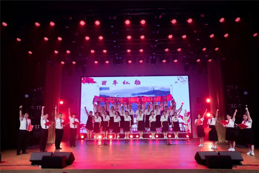 “百年红船,流金岁月……”伴着我们深情的朗诵,屏幕上一叶红船从嘉兴南湖缓缓驶出,开启了引领中华民族书写救亡图存的壮丽诗篇;“保卫家乡、保卫黄河……”激情的指挥、悲壮的歌声把观众带到枪林弹雨的抗日战争时期,唤醒全民族保家卫国的斗志!