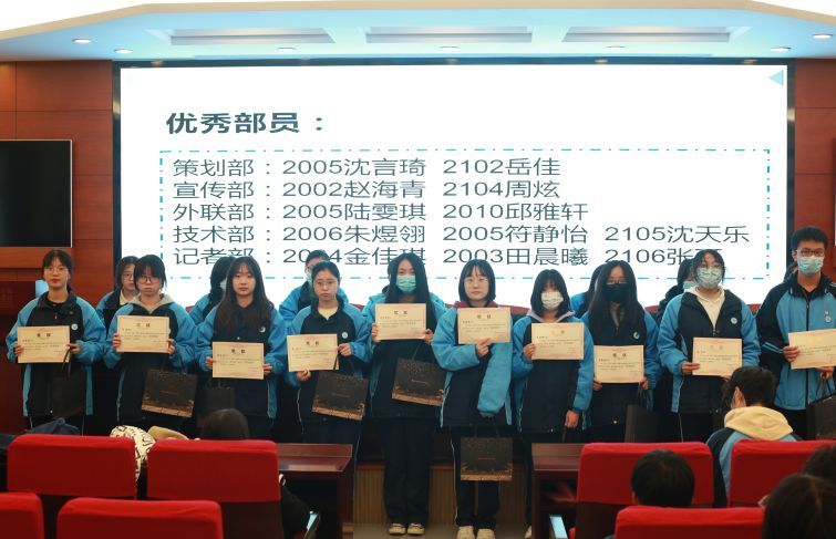 本学期,各部门出现不少积极报名踊跃参与各类活动的部员,许多活动中都能见到这些熟悉的身影,满腔热忱专心致志的完成工作。因此,在大会尾声,各部门选出几位积极认真的同学作为优秀部员上台表彰领奖合影留念。