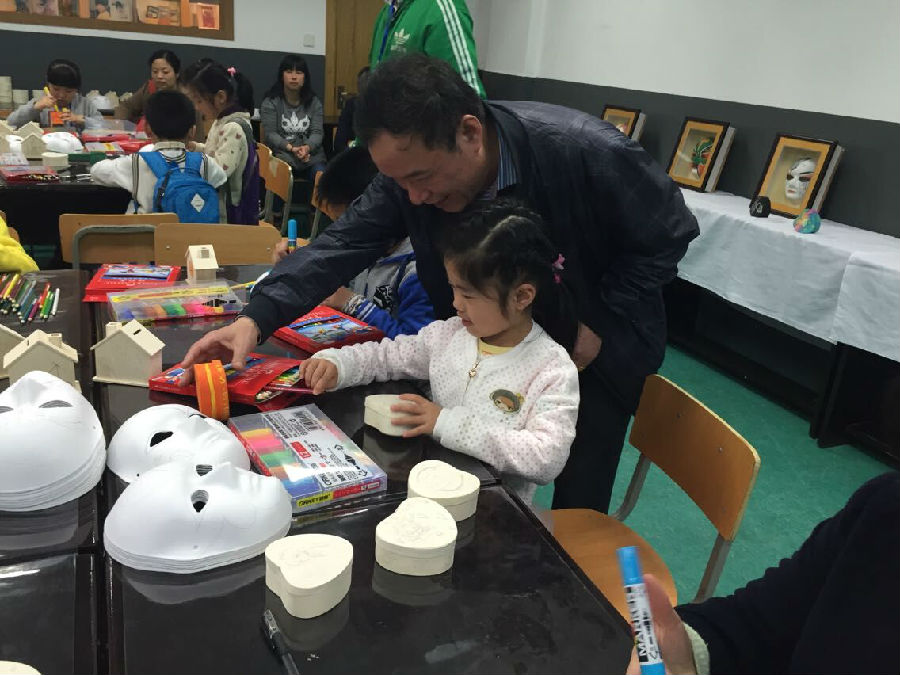 在老师和爷爷的帮助下,小朋友在慢慢完成自己的作品。小朋友,↖(^ω^)↗加油。